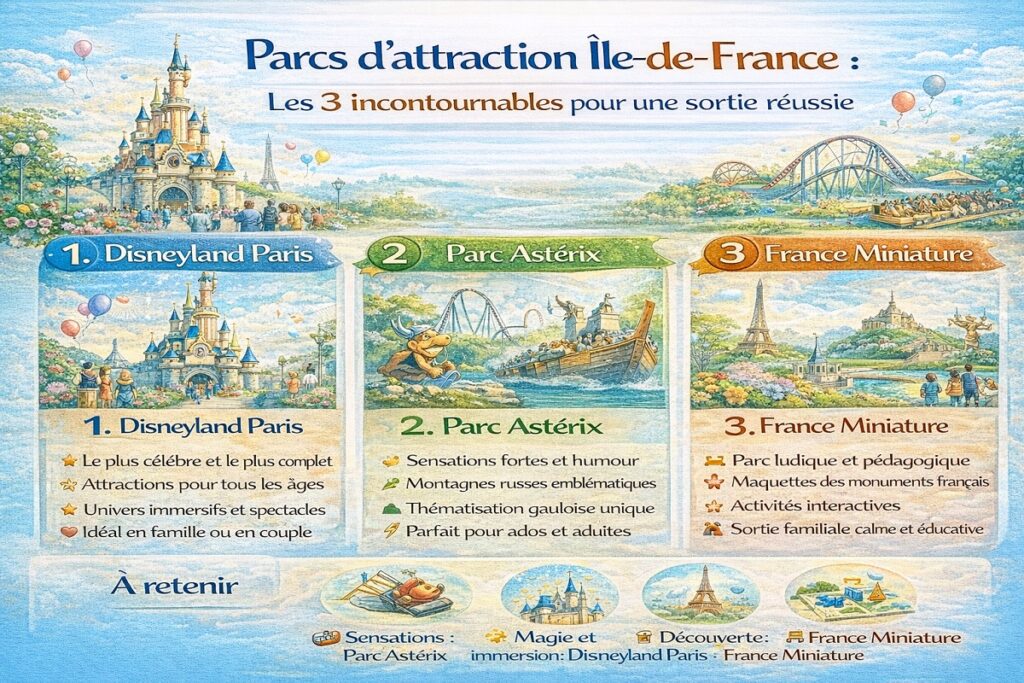 - La magie des trois parcs phares, Disneyland Paris, Parc Astérix, Mer de Sable, c’est ce décalage joyeux, ce frisson d’enfance qui revient même après cent visites, entre parade géante, forêt gauloise, ou dunes pleines de soleil.